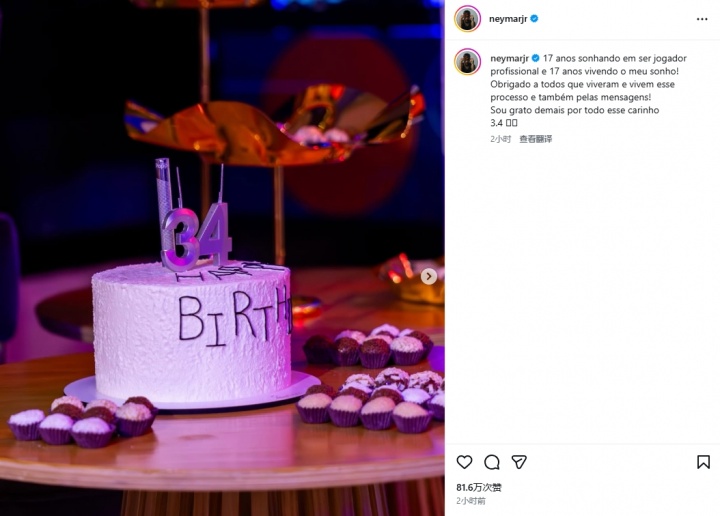 02月06日讯 巴西球星内马尔在社媒发文庆祝了自己的生日,这位曾在巴萨、巴黎、利雅得新月效力的桑托斯球员昨日年满34岁。内马尔在社媒写道:用17年追逐成为职业球员的梦想,用17年在我的梦想之中闯荡!感谢所有曾经历和仍在经历这个过程的人,也感谢大家所有的留言!我对所有的关心均深怀感激。3.4 🤍🖤...